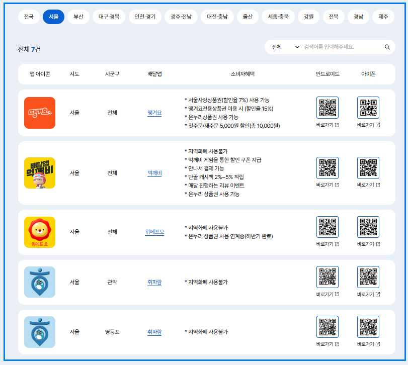 지역에 따라 사용하는 앱이 다르므로, 자신의 거주 지역에서 사용 가능한 공공배달앱을 확인한 후 이용해야 합니다.