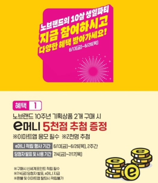 - 오프라인: 전국 이마트 및 노브랜드 전문점에서 ‘10주년 세일’ 스티커가 붙은 제품 구매 시 자동 할인.