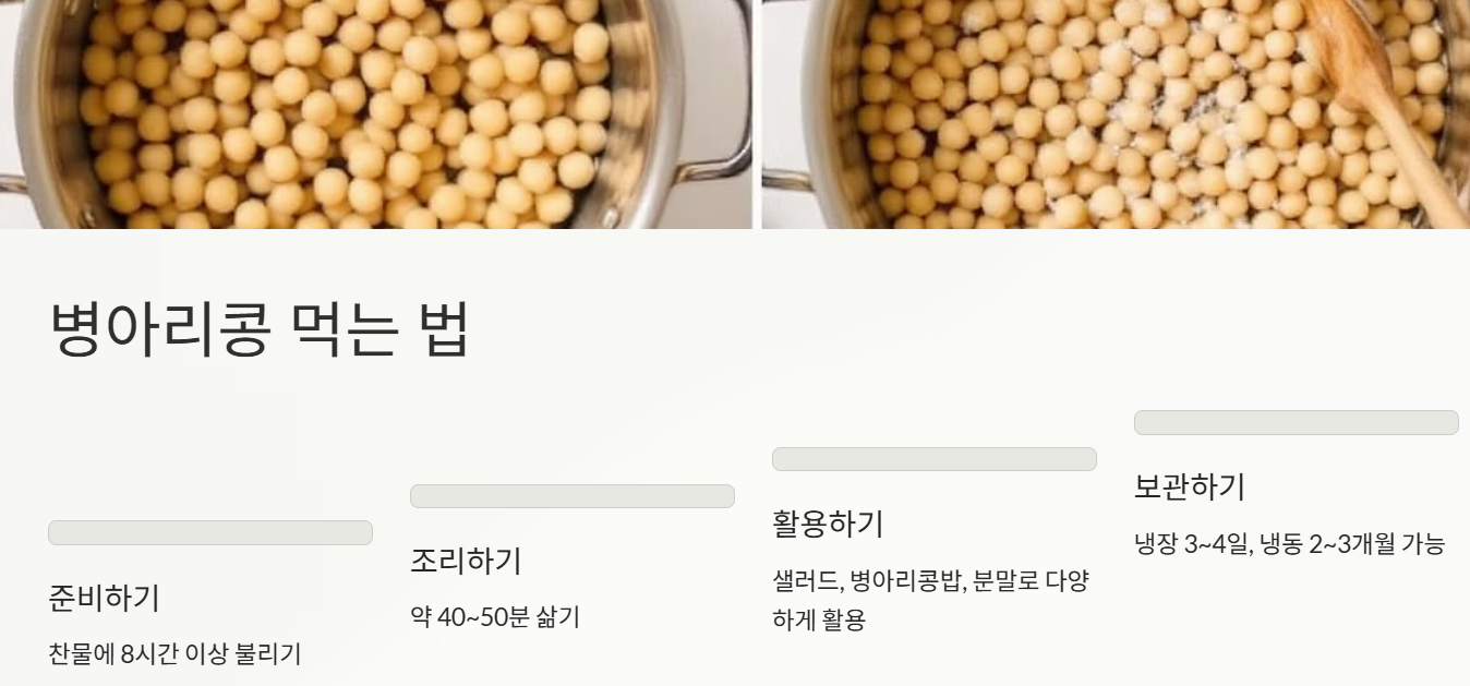 보관법: 삶은 병아리콩은 냉장 보관 3~4일, 냉동 시 2~3개월까지 가능합니다.