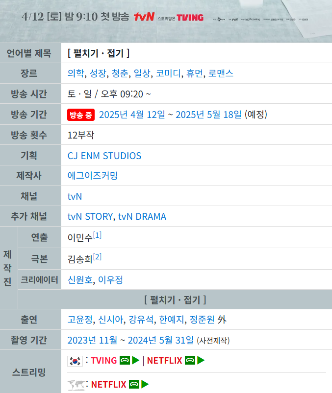 - 배우 이력: ‘환혼’, ‘무빙’, ‘스위트홈’ 등에서 인상적인 연기를 보여준 고윤정. 이번 작품에서는 의학 지식과 인간미가 공존하는 중심 인물로 활약합니다.