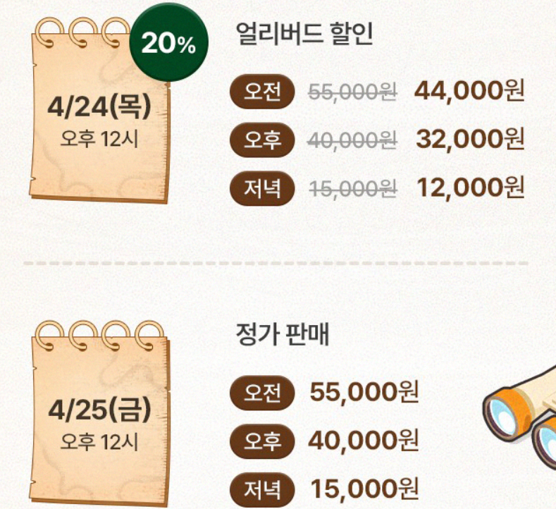• 4월 24일(목) 12시: 전체 회원 20% 할인