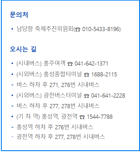 - 주차장: 임시주차장 3곳, 축제장 내 무료 셔틀 운행