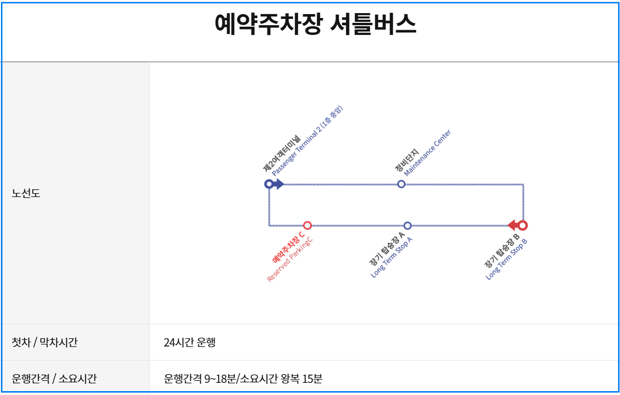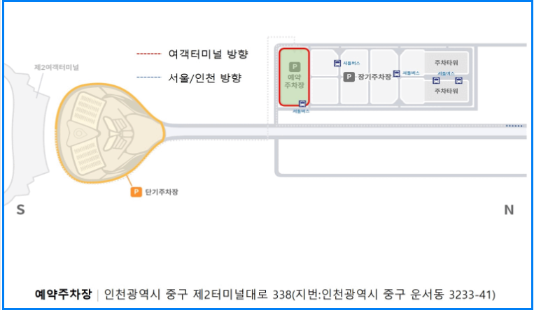 - 제2여객터미널(T2): 장기주차장 1개 운영. 셔틀버스를 이용하여 터미널까지 이동할 수 있습니다.