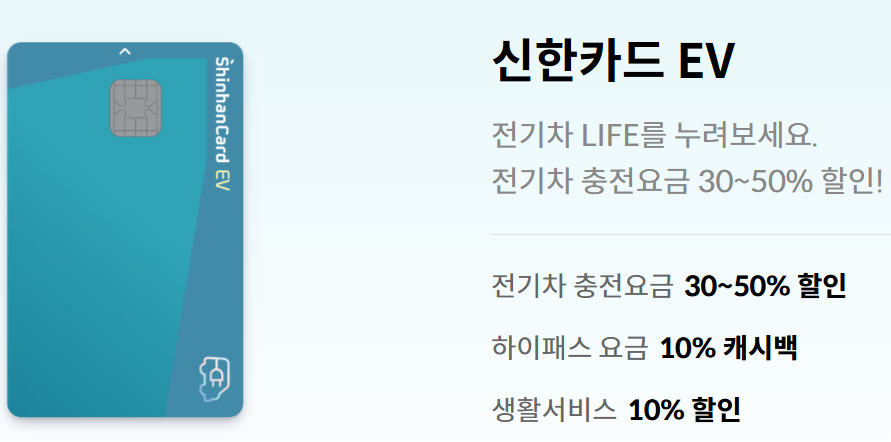신한 EV 카드는 전기차 충전 할인은 물론, 일상 생활에서 자주 이용하는 서비스에 대한 할인 혜택이 풍부하여 실용적입니다.