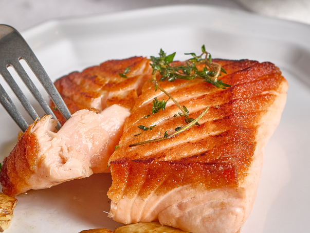 - 조리: 팬에 버터 녹인 뒤 마늘 향내 → 연어 앞뒤 3~4분씩 구우면 완성