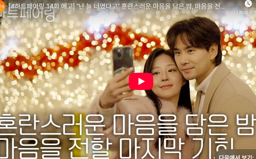 하트페어링 13회, 이제는 진짜 마음이 서로에게로 향하는 시점. 각자의 감정이 더는 숨길 수 없게 드러났고, 이제 그 결과만 남았습니다. 다음 주 최종회 맞나요 벌써 아쉬운... 절대 놓치면 안 돼요. 지제연을 너무 응원하는 애청자입장에서 이번회는 지제연의 모습을 많이 못 봐서 너무 아쉬운 회차이기도 했어요. 그래도 다음회에서 지제연의 크리스마스데이트가 나올 예정이니 한주 잘 참고 응원하고 있어야겠어요.