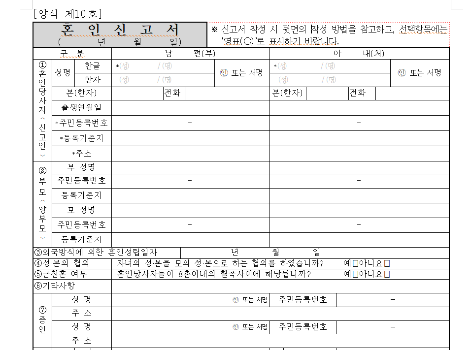- 본인과 배우자의 인적사항 (이름, 주민번호, 주소 등) 기입