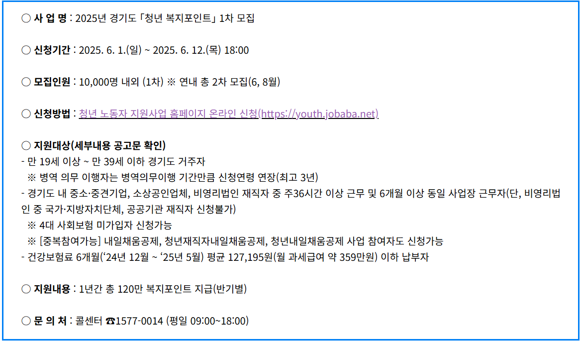 경기도 거주 19~39세 청년 근로자를 대상으로, 1년간 최대 120만 원(분기당 30만 원씩 4회)에 달하는 복지포인트를 제공하는 지원 사업입니다.