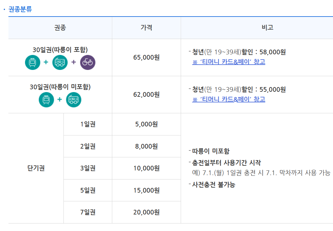 | 이용 지역 | 전국 대중교통 (버스, 지하철 등) | 서울시 내 지하철, 버스, 따릉이 | 전국 대중교통 (버스, 지하철 등) |