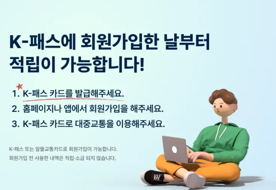 - K패스 공식 홈페이지 또는 앱에서 카드 등록 및 회원가입