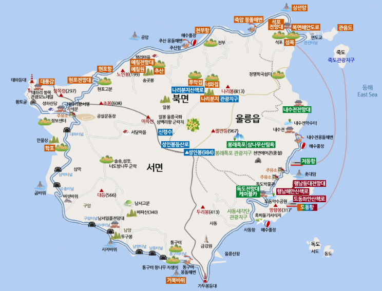 울릉도는 그 자체로 힐링이 되는 자연 공간입니다. 주요 명소로는 독도 전망대, 내수전 일출 전망대, 도동항, 죽도 등이 있으며, 봄~가을 사이가 여행하기 가장 좋습니다.