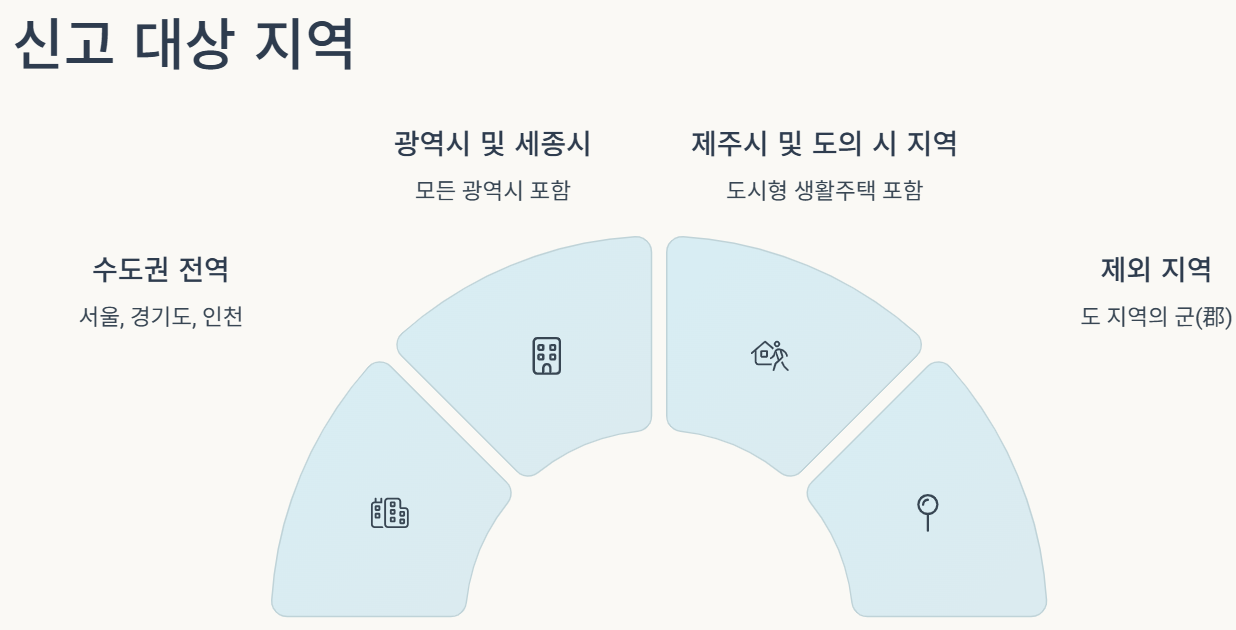 서울과 수도권, 광역시, 세종, 제주, 시 단위 도시 등 대부분의 지역이 신고 대상입니다. 단, 도 지역 내 군(郡) 지역은 제외됩니다. 전국적으로 점차 확대 적용되는 흐름이므로, 비수도권 지역 거주자라도 확인이 필요합니다. 특히 지방 도시 중 도시형 생활주택은 빠짐없이 포함되는 경우가 많습니다.