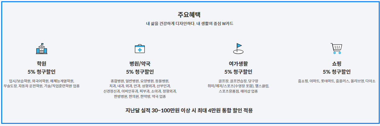 기존 MG+ 시리즈가 20~30대의 디지털 소비에 초점을 맞췄다면, 이 W 카드는 병원, 약국, 학원, 헬스클럽, 마트 등 실생활에서 자주 쓰는 영역에서 혜택을 제공합니다. 특히, 4060세대의 소비 패턴을 깊이 분석해 “자주 가는 곳에서 자동으로 할인”되는 구조로 설계되었습니다.