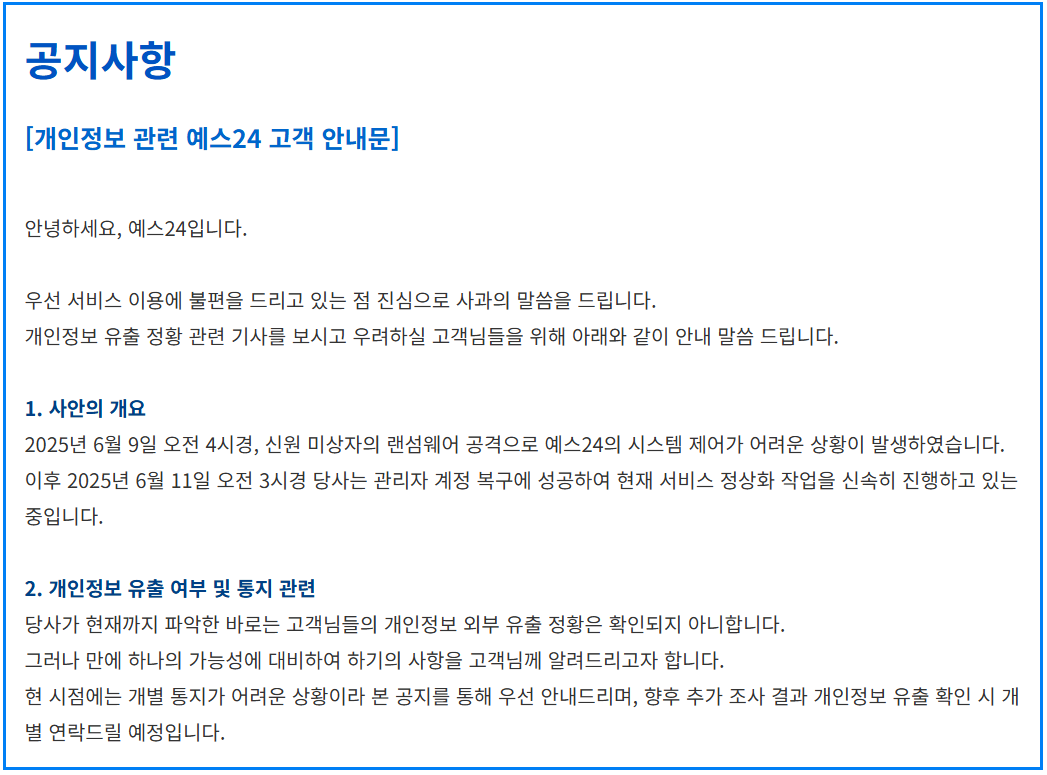 2025년 6월, 평소처럼 책을 사려고 YES24앱에 접속했다가 뜻밖의 상황을 마주쳤습니다. Yes24 결제페이지가 열리지 않고, 사이트는 느려지기만 했죠. 알고 보니 YES24가 랜섬웨어 공격을 받은 것이었습니다.